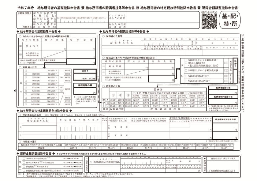 2025年分の様式では、税制改正による基礎控除の見直しや、新たに創設された特定親族特別控除にも対応しています。