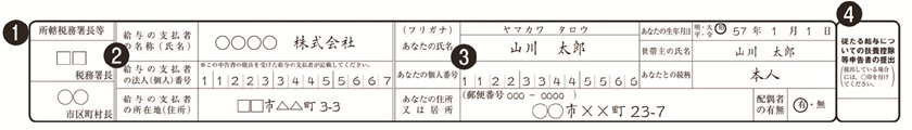 1.氏名、住所などの基本情報を記入します。所轄税務署名や給与支払者に関する情報は、多くの場合あらかじめ印字されています。空欄のまま配布されたときは、勤務先を管轄する税務署名と、会社の名称・所在地を記入してください。