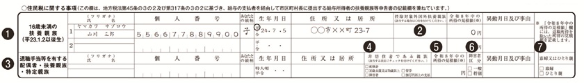4.16歳未満の扶養親族は所得税の控除対象にはなりませんが、住民税の計算には必要な情報です。2011年1月2日以降に生まれた子がいる場合は、忘れずに申告書に記入してください。