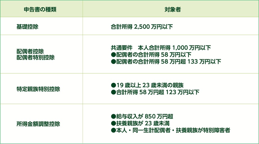 出典:国税庁|給与所得者の基礎控除、配偶者(特別)控除、特定親族特別控除及び所得金額調整控除の申告(外部リンク)