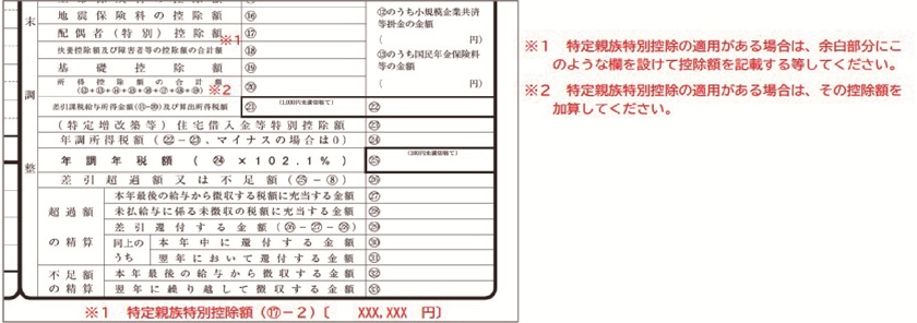 ✓ 「基礎控除・配偶者控除・所得金額調整控除申告書」に「特定親族特別控除申告書」が追加され、1枚に統合