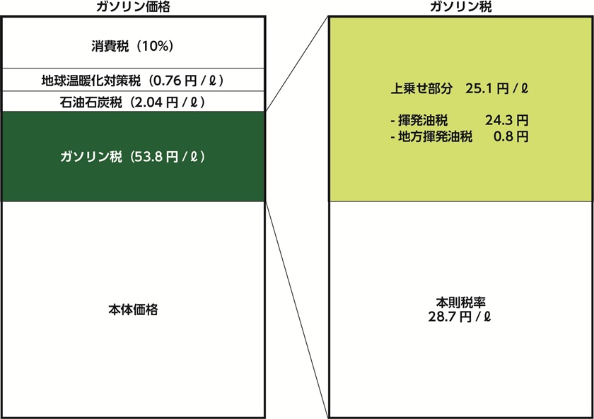 ガソリン税は、ガソリン購入時に課される税金です。「揮発油税」と「地方揮発油税」の2つから構成されており、1リットルあたり53.8円(※)が課されています。