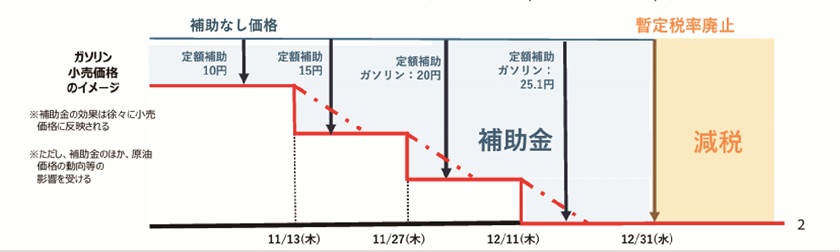 もともと暫定税率は一時的な措置として導入されました。しかし、その後も長く維持されてきたため、見直しの際にはガソリン価格が大きく上下する可能性があります。そこで政府は、補助金を段階的に拡充し、最終的に暫定税率と同水準まで引き上げることで、制度変更による影響を分散させる狙いがあります。