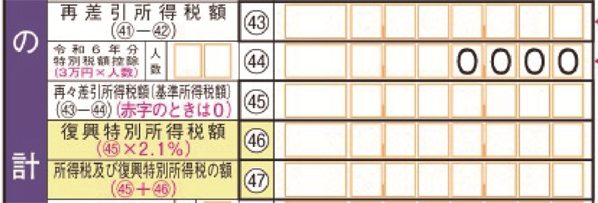 基礎控除の拡充や新しい特別控除の導入に伴い、確定申告書の記入欄や計算様式が一部変更されています。例えば、令和6年分の申告書には、下図のように「定額減税」に関する特設欄が設けられていました。