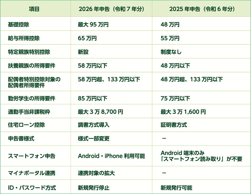 下表は、2026年(令和7年分)と2025年(令和6年分)の確定申告における違いをまとめたものです。