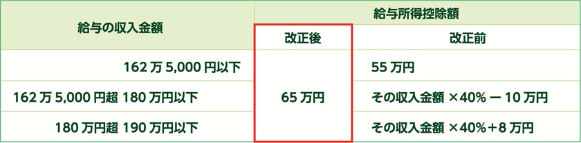 下図のように給与所得控除の最低額が55万円から65万円へと10万円引き上げられます。