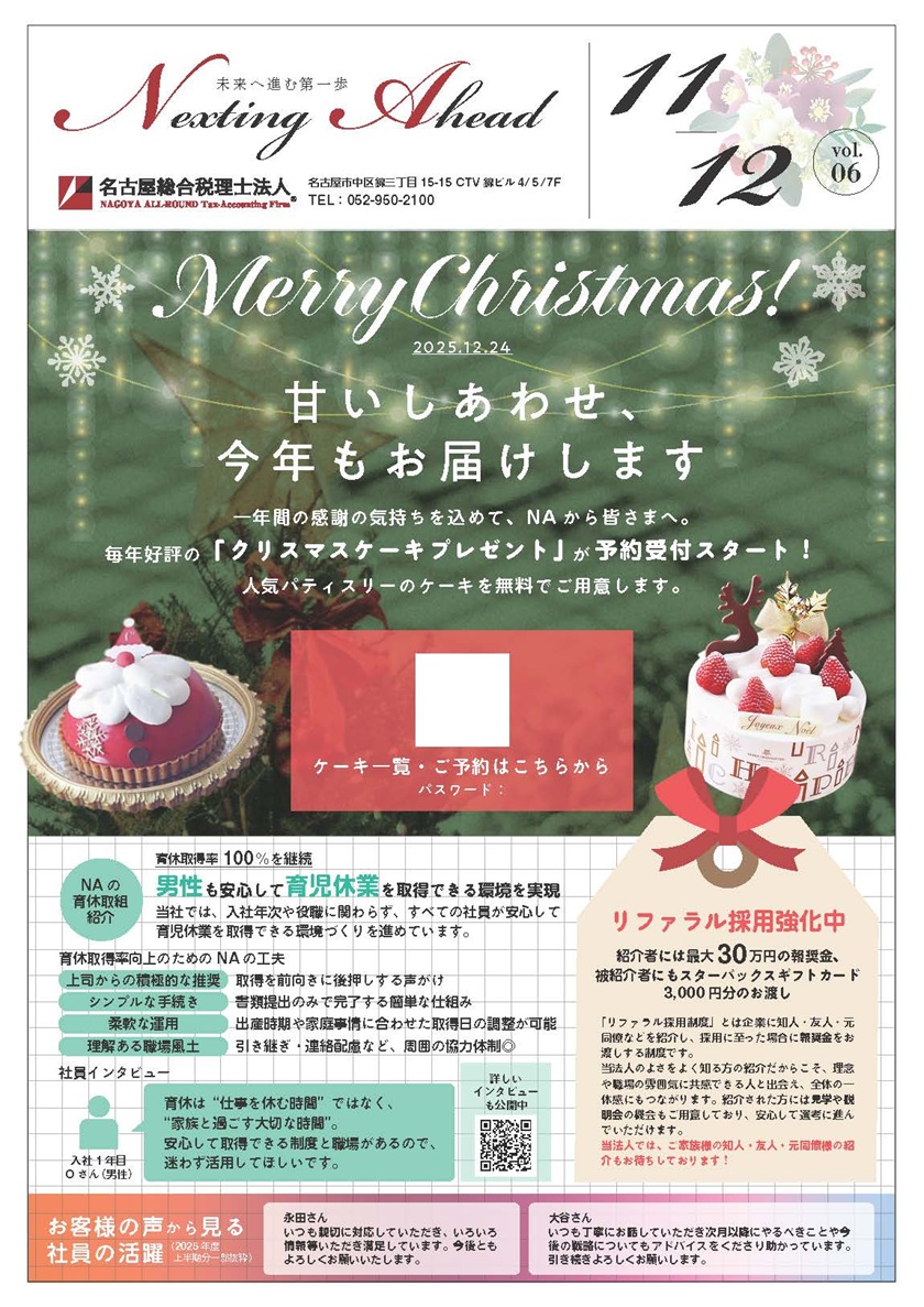 名古屋総合税理士法人(以下、当法人)では、社内広報誌『Nexting Ahead(ネクスティング・アヘッド)』を定期発行しており、この度、2025年11–12月号を発行いたしました。本号では、年末に向けた季節企画や、当法人が継続して取り組む働きやすい職場づくりに関する取り組みなど、多彩な内容をお届けしています。