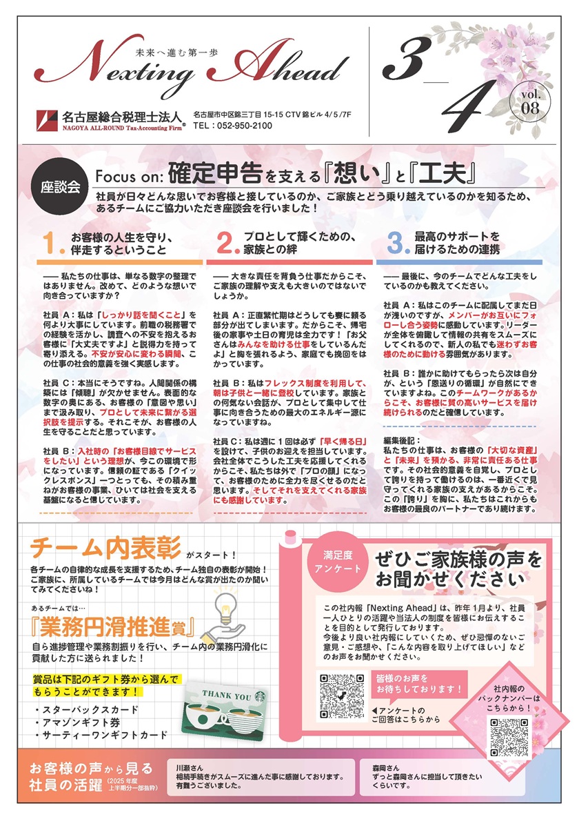 名古屋総合税理士法人(以下、当法人)では、社内広報誌『Nexting Ahead(ネクスティング・アヘッド)』を定期発行しており、この度、2026年3-4月号を発行いたしました。本号では、社員による座談会「申告を支える『想い』と『工夫』」や、新たにスタートしたチーム内表彰制度などを掲載し、お客様に寄り添う姿勢やチームワーク向上のための取り組みを紹介しています。